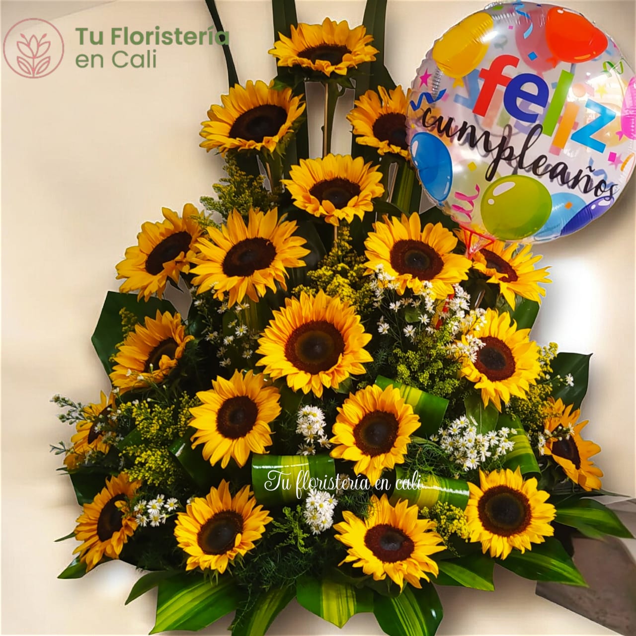 Arreglo floral estilo pirámide, elaborado en solo girasoles, su respectivo follaje y un globo de tu preferencia