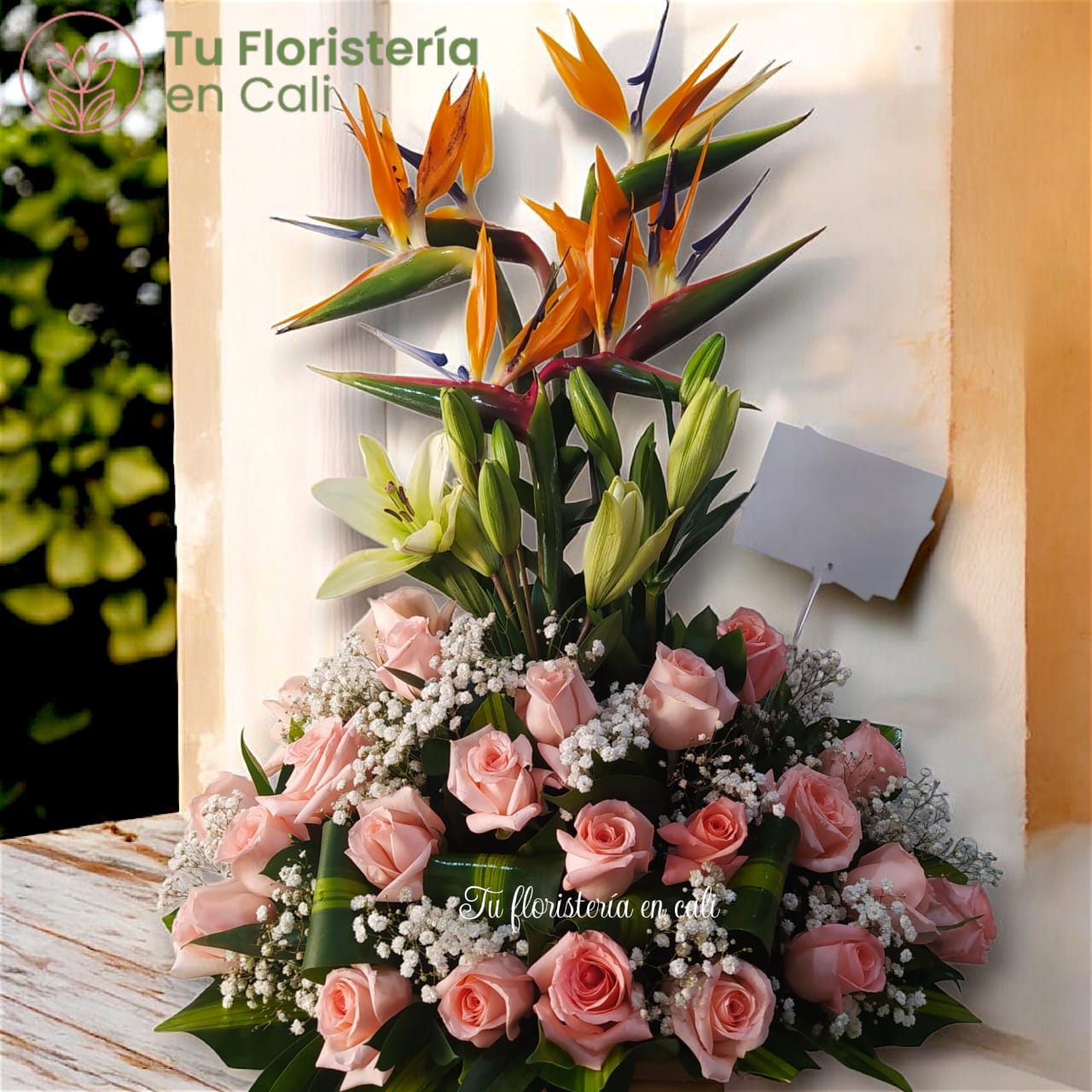 Arreglo floral en base de madera elaborado con rosas rosadas, lirios blancos, ave del paraíso y su respectivo follaje