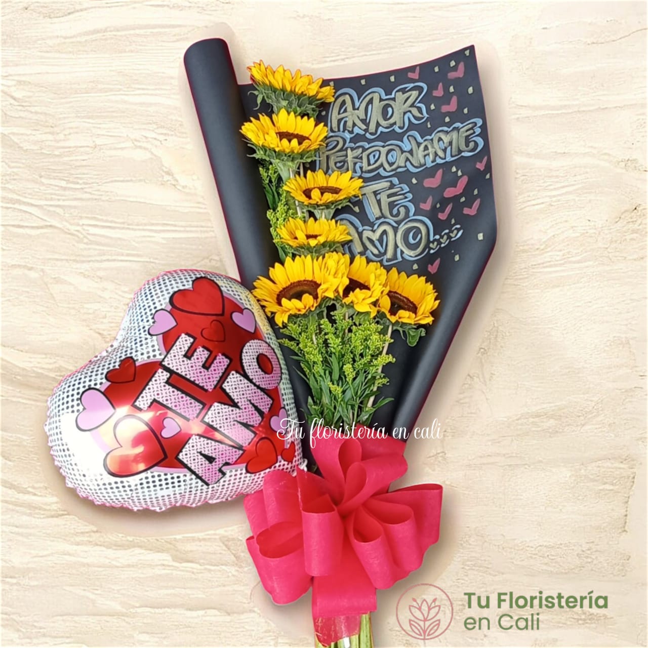 Bouquet de mano elaborado en girasoles, mensaje personalizado en empaque, globo y su respectivo moño